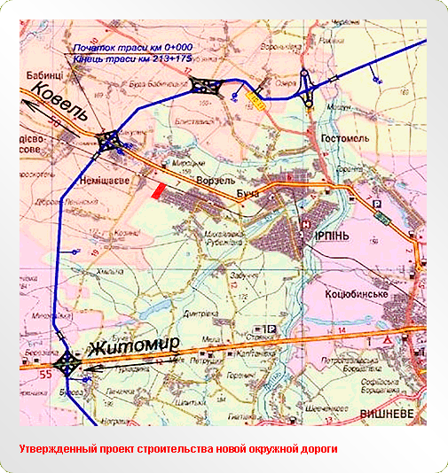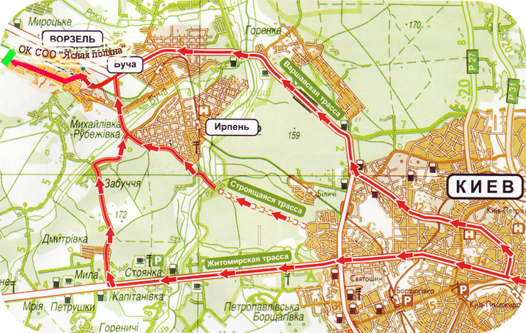 - на автівці зручно доїхати трьома шляхами на вибір: Ковельською трасою (так звана Варшавка) через п. Буча та п. Ворзель від пл. Шевченка у Києві всього 25 км.; Житомирською трасою через с. Дмитрівка та с. Михайлівка-Рубежівка від Окружної дороги всього 26 км.; Новоірпінським шосе через м. Ірпінь та п. Ворзель всього 24 км.